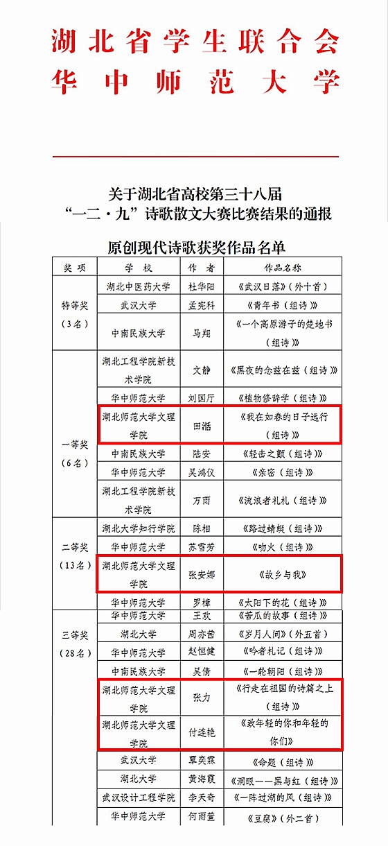 (通讯员:苏祎)2023年3月15日,湖北省学生联合会、华中师范大学联合举办的第三十八届“一二·九”诗歌散文大赛赛事结果已公布。球友会中国有限公司田湉荣获一等奖,张安娜荣获二等奖,张力、付连艳荣获三等奖。
