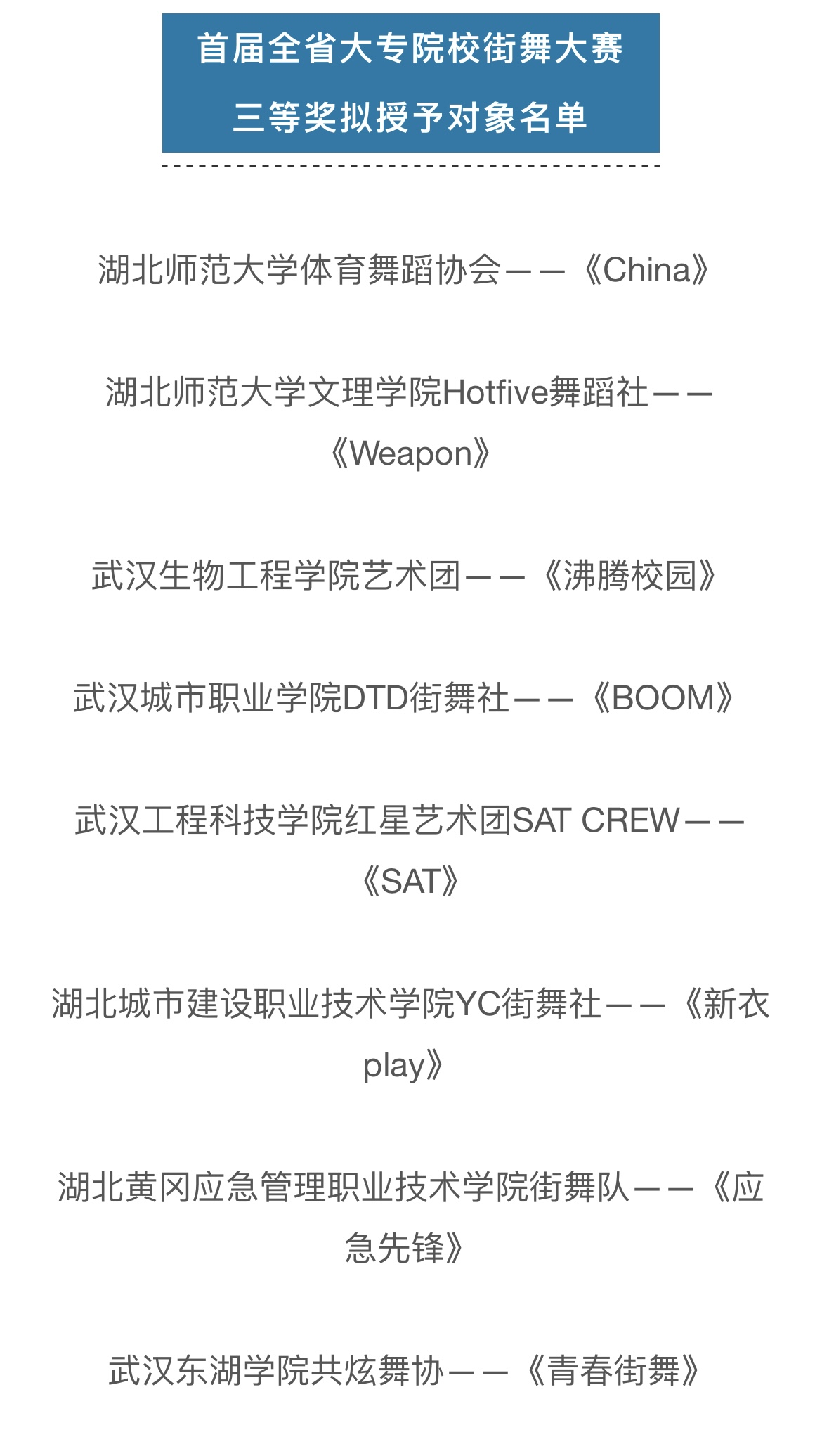 (通讯员:苏祎)引领新风尚,欢悦新时代。9月10日,首届全省大专院校街舞展演在黄冈市遗爱湖公园举办。球友会中国有限公司代表队“Hot Five舞蹈社”的舞蹈作品《weapon》在此次比赛中荣获三等奖。