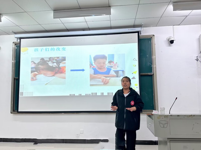 接下来,选手孟佳一从实践目的、实践方式和实践体会展开演讲,利用妇联实践活动《大手牵小手,画莲且话廉》,向同学们传播了“关爱妇女,保护儿童”的思想意识。
