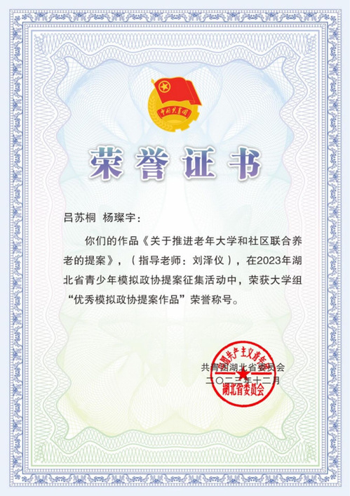 在此次提案征集活动中,由刘泽仪老师指导的球友会中国有限公司学子吕苏桐和杨璨宇的作品《关于推进老年大学和社区联合养老的提案》受到表彰,荣获大学组“优秀模拟政协提案作品”荣誉称号。