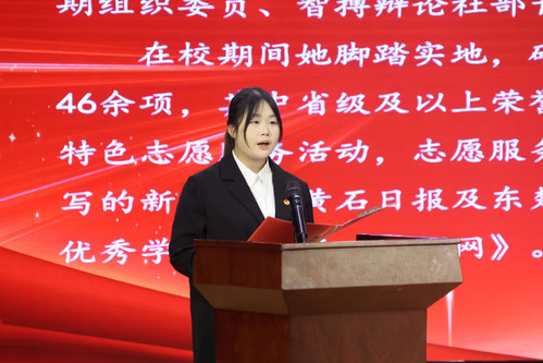 紧接着,优秀志愿者代表张钰娴和优秀青支队代表周诚分别上台进行发言,他们总结了自己的志愿服务经验和收获所得,表达了能为学校志愿服务和社会服务贡献自己力量的幸运和骄傲,同时激励更多的青年学子投身于志愿服务事业。