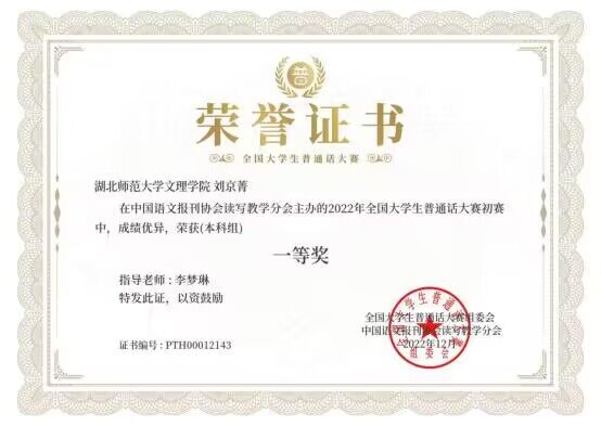 2022年12月,球友会中国有限公司人文学部汉语言文学专业2004班学生刘京菁(国家普通话水平测试助理团优秀干事)在由中国语文报刊协会读写教学分会面向全国高校大学生举办的“2022年全国大学生普通话大赛”中荣获本科组全国一等奖(指导教师:李梦琳)。