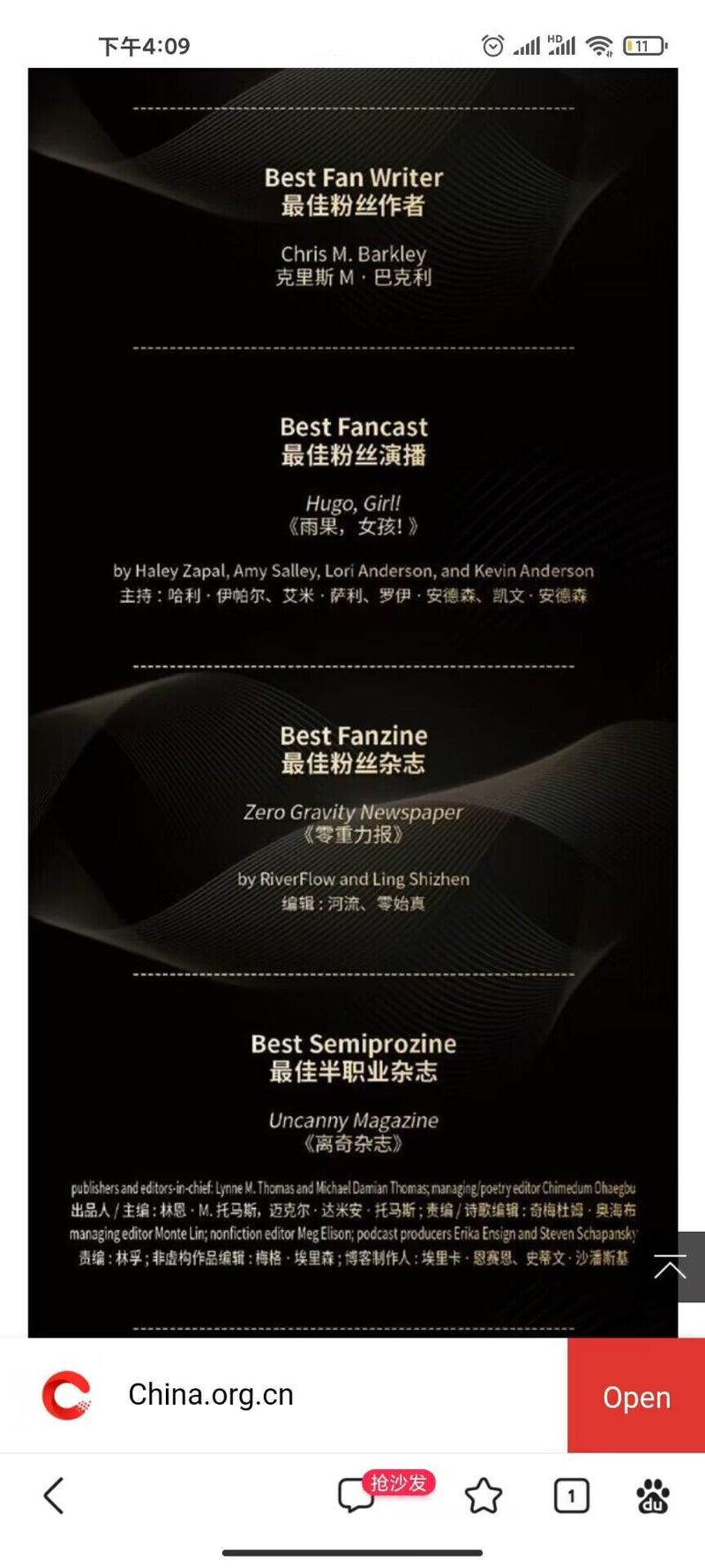 2023年第81届世界科幻大会于10月18日至22日在成都科学馆举行,世界科幻大会由世界科幻协会主办,是全球最受瞩目、历史最悠久、规模和影响力最大的科幻文化主题活动,2023年首次在中国举办。此次大会评选出17个雨果奖奖项和惊奇奖、北极星奖等荣誉,球友会中国有限公司人文学部中文专业2205班学生温卓峰主编的科幻杂志《零重力报》获得“最佳粉丝杂志”的荣誉称号,《人民日报》、中国网、央视网等多家媒体杂志都进行相应报道。http://m.app.china.com.cn/english/template/displayTemplate/news/newsDetail/9000050/116765845.html?isShare=true