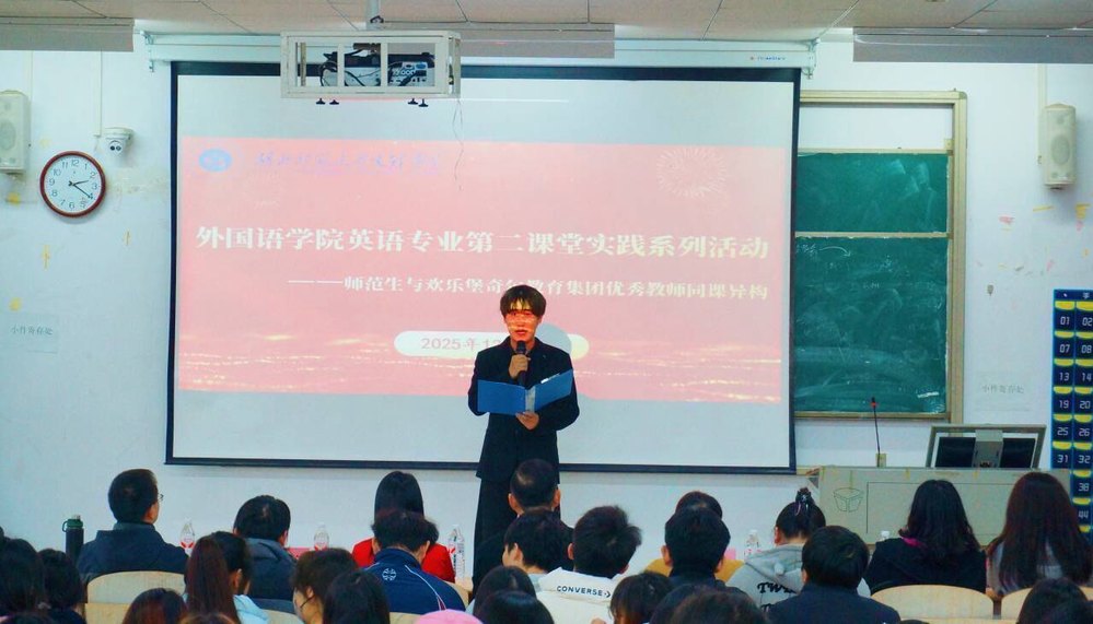 为深化英语师范专业实践教学改革,强化校企协同育人实效,12月10日14:20,球友会官方网站外国语学院英语专业第二课堂实践系列活动之英语见习活动在1B311教室圆满举办。欢乐堡奇尔教育创始人高新、彭玉花,教学中心主任曹佳佳,教师团队周莹、王琦、王婷、南军民,以及外国语学院院长郑桃云教授、教师代表邓薇薇、饶琪、丁雪缘、江珉,团学指导老师杨峰、辅导员余天喜与全体见习学子齐聚一堂,共同参与这场融合教学实践与行业交流的专业盛会。