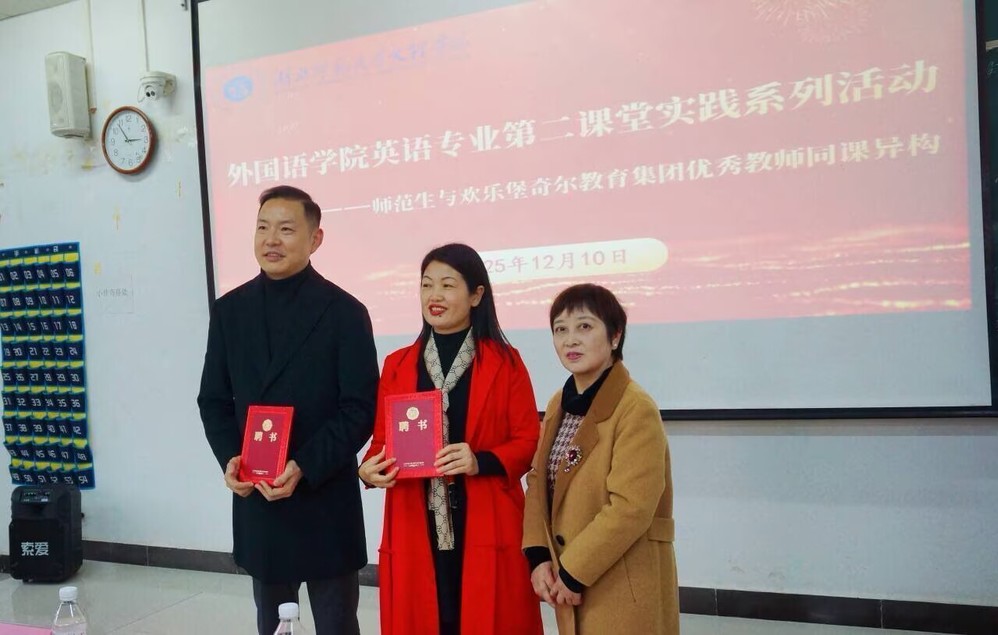 活动期间,欢乐堡奇尔教育创始人高新、彭玉花面向在场学子发布人才招募计划,详细介绍岗位设置、任职要求与职业成长通道,为学生搭建起职业发展的优质对接平台。郑桃云院长为新聘的本科生行业导师颁发聘书,这一环节标志着学院校企合作育人模式的进一步完善。活动尾声,全体领导与师生合影留念,为本次见习活动画上圆满句号。