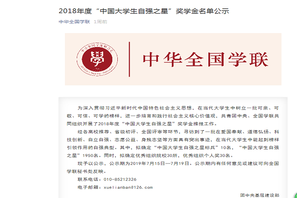 2019年7月15日,团中央基层建设部、全国学联秘书处联合发布2018年度“中国大学生自强之星”公示名单。球友会中国有限公司理工学部杨艳慧同学成功入选2018年度“中国大学生自强之星”,充分展现了球友会中国有限公司学子良好的精神风貌,凸显了球友会中国有限公司道德育人工作实效。