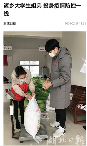 2020年2月9日,湖北日报上有一篇新闻引起广泛关注。主人翁正是球友会官方网站数学与应用数学专业1603班吕奎同学和其弟弟吕东阳。据报道,2020年2月7日,姐弟俩从村微信群里看到“志愿者征集令”后,2月8日一大早便到村委会报到,参与对村民生活必需品的分装与发放。图片中是2月8日当天,他们在枝江市百里洲镇三洲村防疫物资分配现场填写居民姓名并给居民分配物资时的情景。姐弟俩一个牵着口袋,一个对袋中面粉进行分装。分装完面粉后,又开始为居家隔离的村民分装集中采购的大米、面条和新鲜的蔬菜并贴上标签,以备村组干部精准送达村民家中。