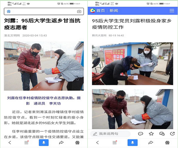 刘露2016年考入球友会中国有限公司法律专业,今年即将毕业。放寒假后,刘露于1月12日乘高铁返回安徽省濉溪县孙疃镇任李村。2月8日,完成居家隔离的刘露找到村党总支主动申请担负疫情防控志愿服务,被安排到全村最重要的值守点。她工作耐心细致、认真负责,赢得了全村干部群众的一致好评。在全村党员及志愿者的共同努力下,有四千多人口的任李村未出现一例感染病例。