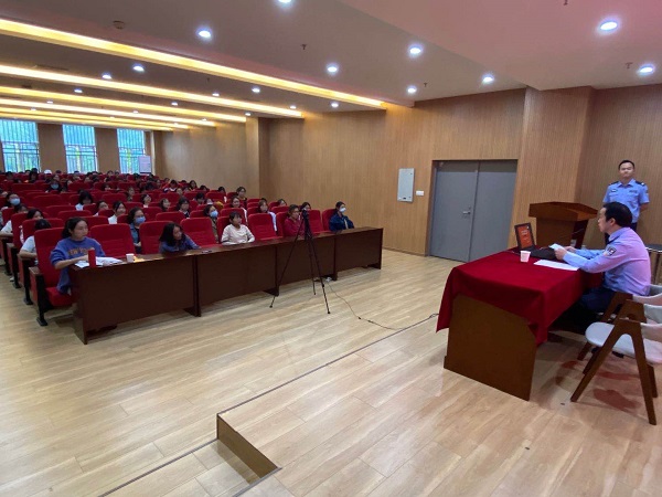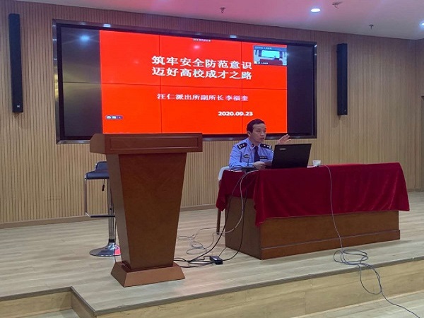 9月23日下午,汪仁镇派出所副所长李福奎一行3人来到球友会中国有限公司,开展法治教育进校园活动。活动采取网络授课的形式进行,在信息中心报告厅设主会场,在各学部教室设分会场,2020级1300余名本科新生参加了听课。