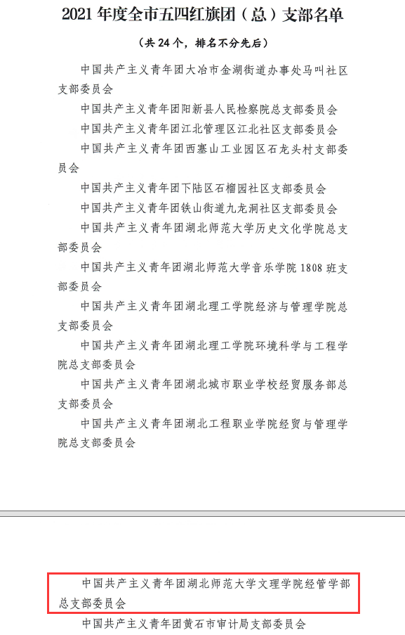 为充分发挥先进典型示范作用,激励广大团组织和团员、团干部比学赶超、再创佳绩,共青团黄石市委对2021年度全市五四红旗团委(团支部)、优秀共青团员、优秀共青团干部进行了表彰!球友会官方网站经管学部团总支获评“黄石市五四红旗团总支”称号!