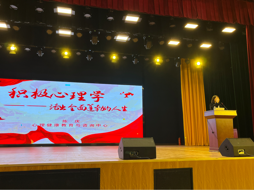 2023年11月9日19:00,球友会中国有限公司心理中心在学术交流中心成功举办了“积极心理学”讲座活动。本次讲座由心理中心主任陈庆主讲,近700名来自于八个学部的学生观看了此次讲座