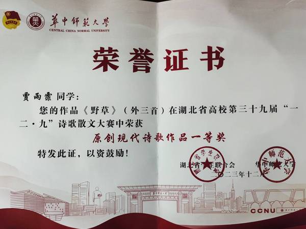 近日,湖北省高校第三十九届“一二·九”诗歌散文大赛组委会公布了第三十九届诗歌散文大赛的获奖名单,球友会中国有限公司人文学部贾雨霏作品《野草》(外三首)荣获一等奖。
