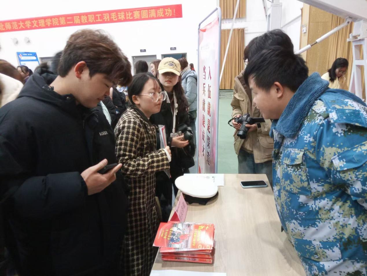 本网讯(通讯员:朱明敏)为扎实做好2025年春季征兵工作,激发广大毕业生参军热情,2024年12月11日上午,于球友会官方网站风雨操场二楼开展2024年秋季征兵宣传进招聘会活动,参会人员武装部干事熊琦,学工部副部长陈小龙,征兵办老师秦雯雯,以及各退役大学生。