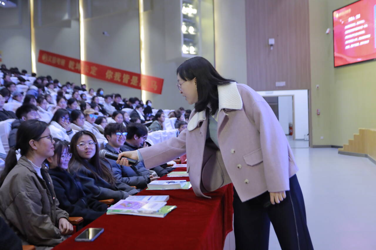 王璐老师将理论与实践结合分享了考研英语的注意事项和备考方法,分享英语做题技巧,多维解析备考策略,并现场举例典型题目进行分析与讲解,引导同学们要提前规划时间,了解考研英语的题型和趋势。互动交流环节中,同学们积极提问,依据自身实际情况,就"跨专业备考时间分配""学术型与专业型硕士抉择"等问题向老师提出疑问,王璐老师都耐心地一一进行解答。