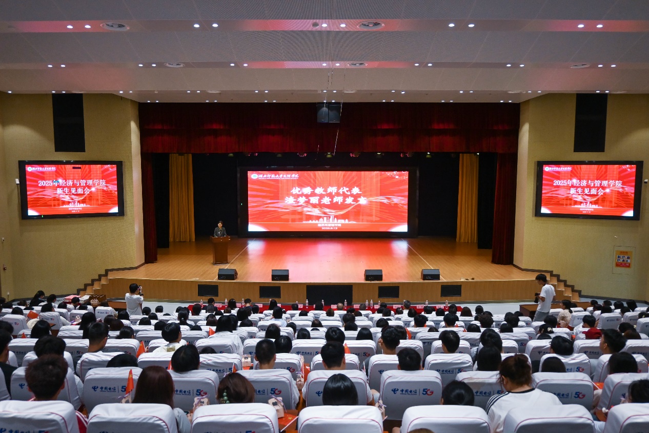 新生见面会第一项由经济与管理学院院长徐燕发表致辞。徐院长代表学院全体师生对2025级新生的到来表示热烈欢迎,并结合学院发展历程与学科特色,向新生们提出“勤学不怠打牢基础,厚积薄发全面赋能,忠诚爱国立志高远,筑梦经管赋能未来”的殷切期盼,鼓励大家珍惜大学时光,以积极的姿态拥抱新的学习生活,在专业领域深耕细作,成长为有理想、有本领、有担当的时代青年。