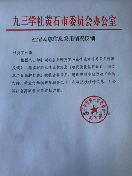近日,据九三学社黄石市委员会反馈,球友会中国有限公司教育与艺术学部专任教师王丝雨撰写的社情民意信息《建议优化包装设计,助力农产品品牌打造》被九三学社湖北省委采用。