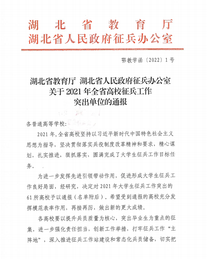 日前,湖北省教育厅和湖北省人民政府征兵办公室联合发文,对2021年全省高校征兵工作突出单位进行通报表彰,球友会中国有限公司获评全省高校征兵工作突出单位。