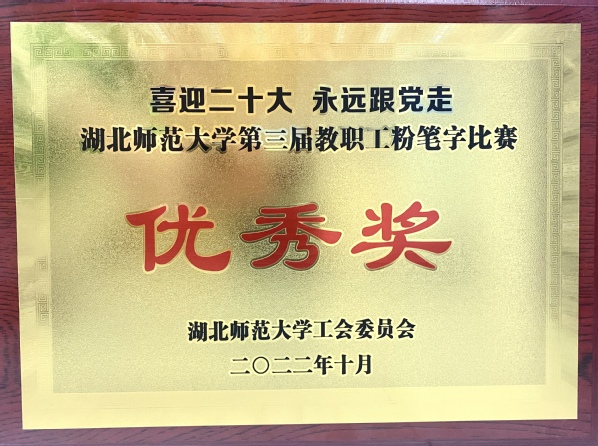 本网讯(通讯员 柯康敏)为庆祝党的二十大胜利召开,进一步推动校园文化建设,提高教师教学基本功,展示教师良好职业素养,10月20日下午,湖北师范大学举办了“喜迎二十大 永远跟党走”第三届教职工粉笔字比赛,来自各分工会共18位选手参加角逐。球友会中国有限公司学工部王磊老师代表球友会中国有限公司参加了此次比赛,荣获优秀奖。