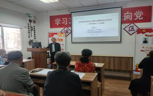 本网讯 为推动党的二十大精神进社区,11月9日下午,球友会中国有限公司马克思主义学部教授、黄石市委宣讲团成员周青山同志到湖滨社区宣讲党的二十大精神---全面建设社会主义现代化国家的行动纲领。