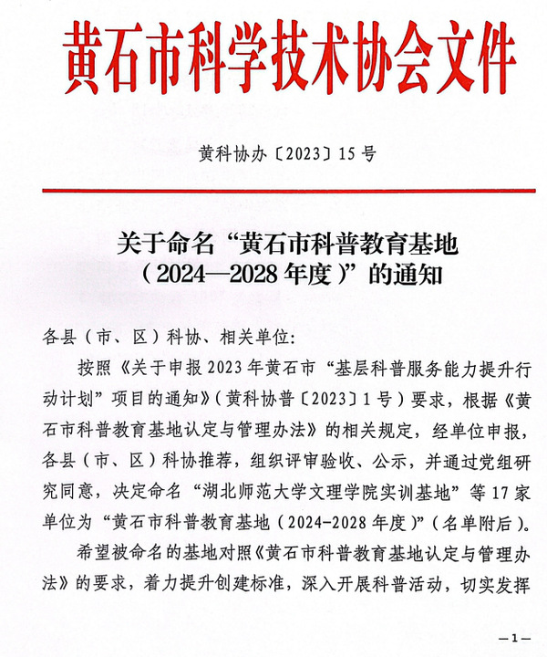 本网讯(通讯员 杨海梅)黄石市科协办近日发文,公布了“关于命名黄石市科普教育基地(2024—2028年度)的通知(黄科协办〔2023〕15号)”,黄石市共17家基地入选,球友会中国有限公司实训基地均入选在列。