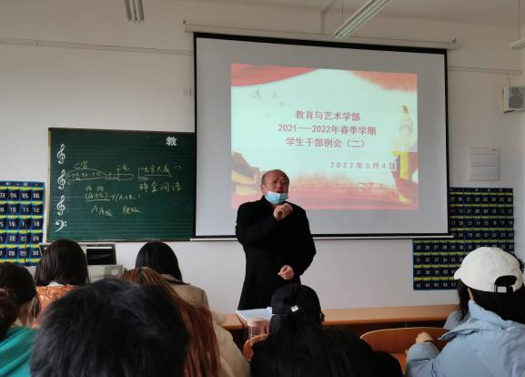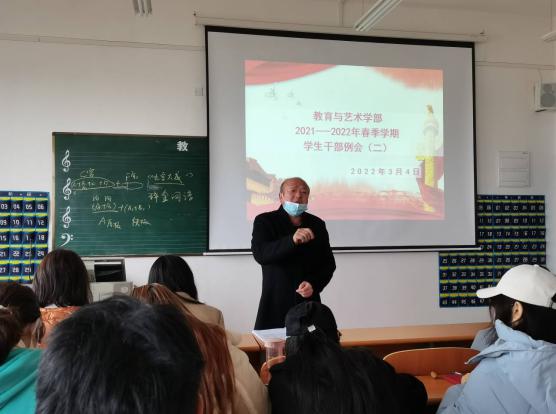 202234日中午1200,教育与艺术学部按照惯例在实验楼一栋403多媒体教室组织召开学生干部工作例会。出席本次会议的人员有辅导员老师、团学会干部及各专业班级负责人。会议由党总支书记李先华主持。