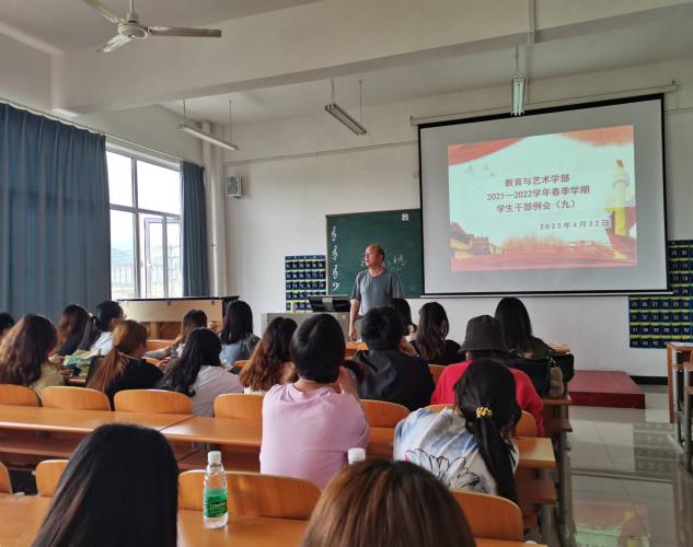 2022422日中午1200,教育与艺术学部按照惯例在实验楼一栋403多媒体教室组织召开学生干部工作例会。出席本次例会的有辅导员、团学会干部及各专业班级班长。会议由党总支书记李先华主持。