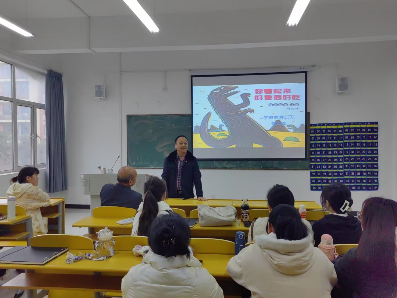 由曾玉芝同学带来了绘本故事《你看起来很好吃》,通过绘声绘色、富有深情的表演,让在场的师生不由得进入故事中,体会到爱与被爱的快乐。微演讲结束后,王文主任对学生的表现进行了点评,并结合学前教育专业的就业趋势,强调在当前严峻的社会竞争中,各位同学要不断地提高自身的专业技能,做最优秀的那一位。同时,鼓励同学们要树立考研、考编、考公的学习目标,提前规划自己的人生,做人生的赢家。