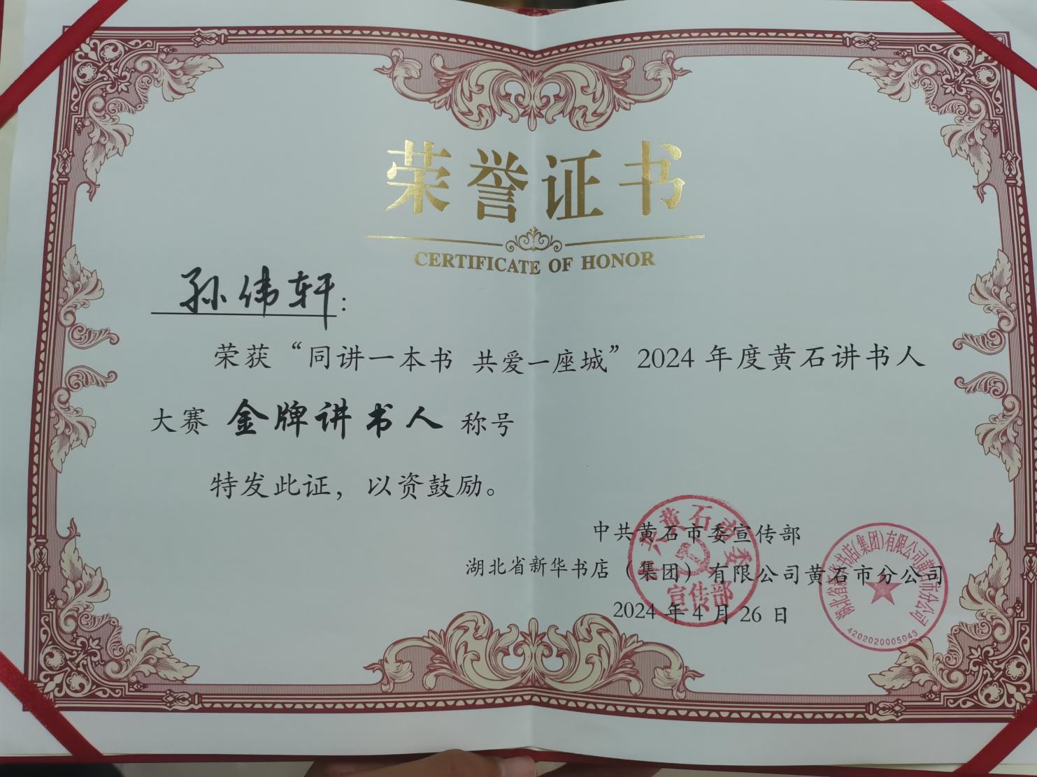 来自黄石市教育局(中小学)、湖北师范大学、湖北理工学院、球友会官方网站、湖北工程职业学院等23名选手参加了激励角逐,我部小学教育2105班的孙伟轩同学用自己独特的视角和方式,讲述了黄石的历史变迁、风土人情,黄石人的顽强向上钢铁精神,表达了对黄石以及长篇小说《钢的城》的炙热情感。他的精彩表现获得了9.72分的高分,位居第一,荣获“金牌讲书人”称号。