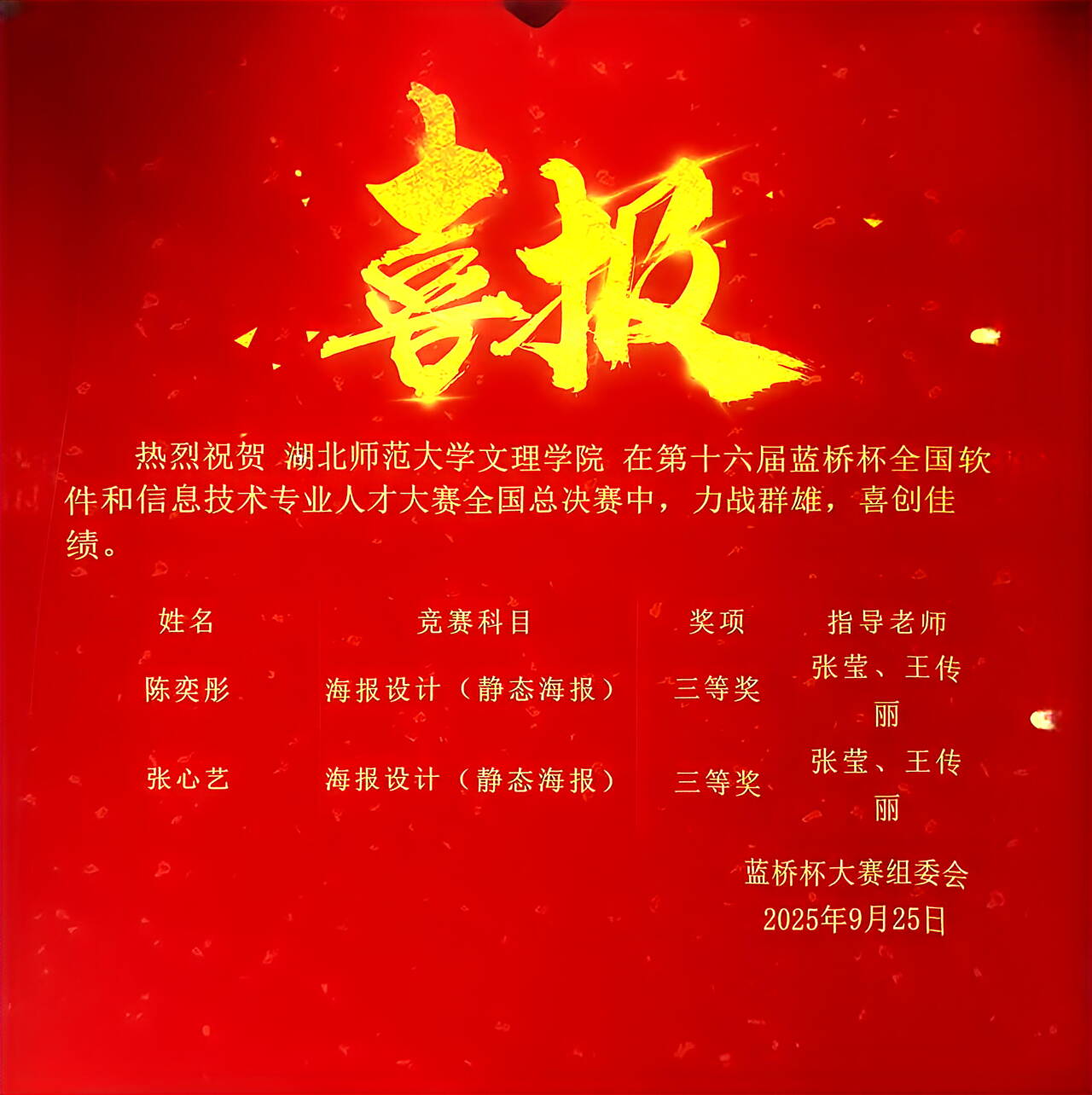 近日,第十六届“蓝桥杯”全国软件和信息专业技术人才大赛全国总决赛落下帷幕。球友会官方网站艺术与教育学院美术专任教师张莹、王传丽指导学生参赛,在视觉艺术设计平面设计赛道中脱颖而出,斩获全国三等奖,不仅为学校赢得荣誉,更一举突破本校在该赛事中的学生获奖历史记录,书写了艺术与技术融合育人的崭新篇章。